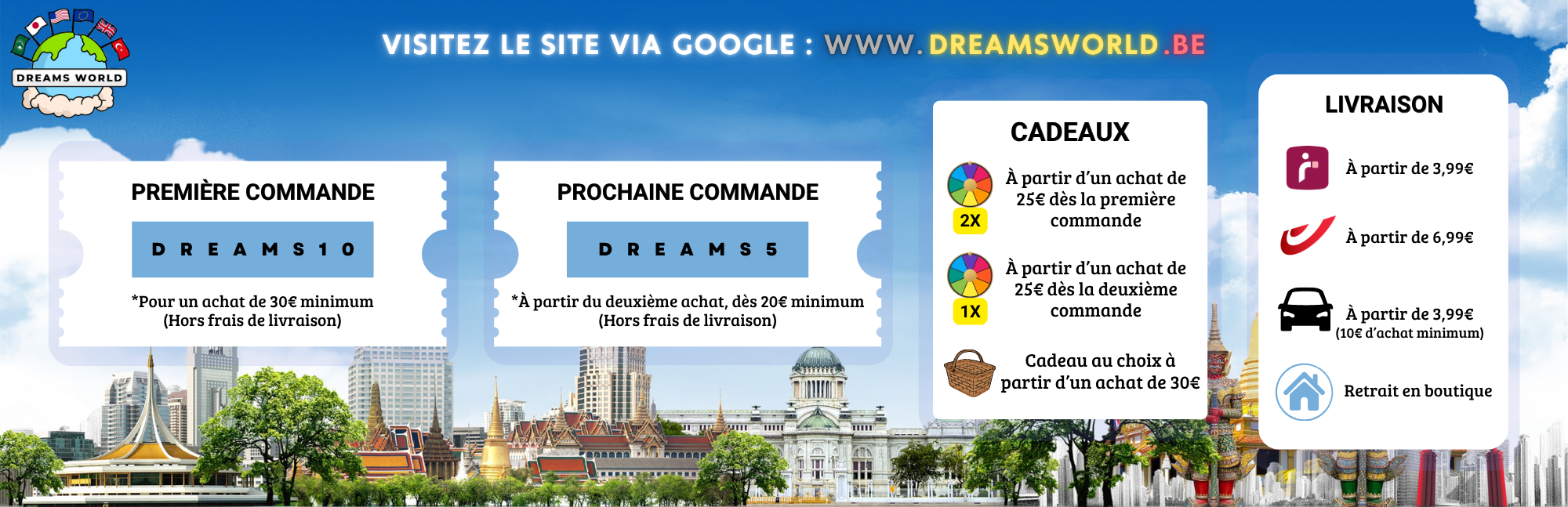 Avec MONDIAL RELAY, les colis ont une garantie par défaut de 25€. Pour couvrir la totalité de la commande, vous devez payer un supplément par virement bancaire à Dreams World.